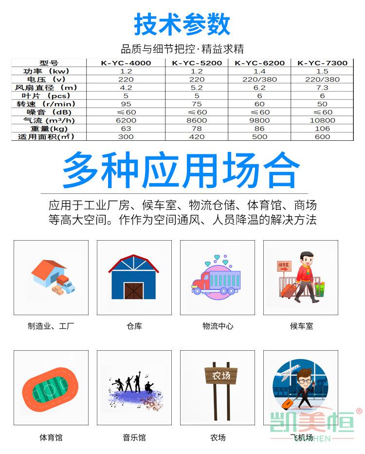 产品描述: 上海凯美恒品牌大型工业吊扇,永磁节能大风扇,工业大风扇,工业大吊扇也被称为“工业大风扇”最大直径7.3米,覆盖面积600平方米,功率1.5KW。可以做到自然通风、超大覆盖面积,是夏季开放式空间降温纳凉的解决之道。大吊扇即大风扇。大吊扇是专门为节能降耗、改善工作环境舒适度而开发的一系列产品。